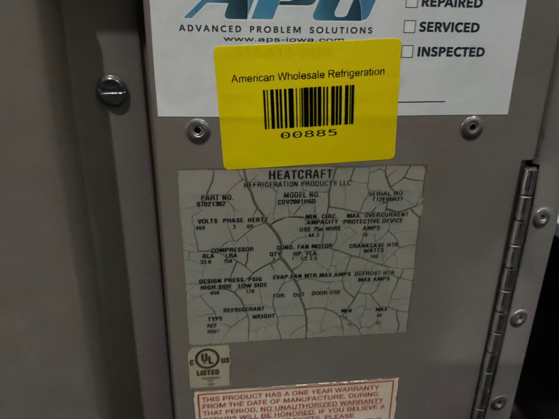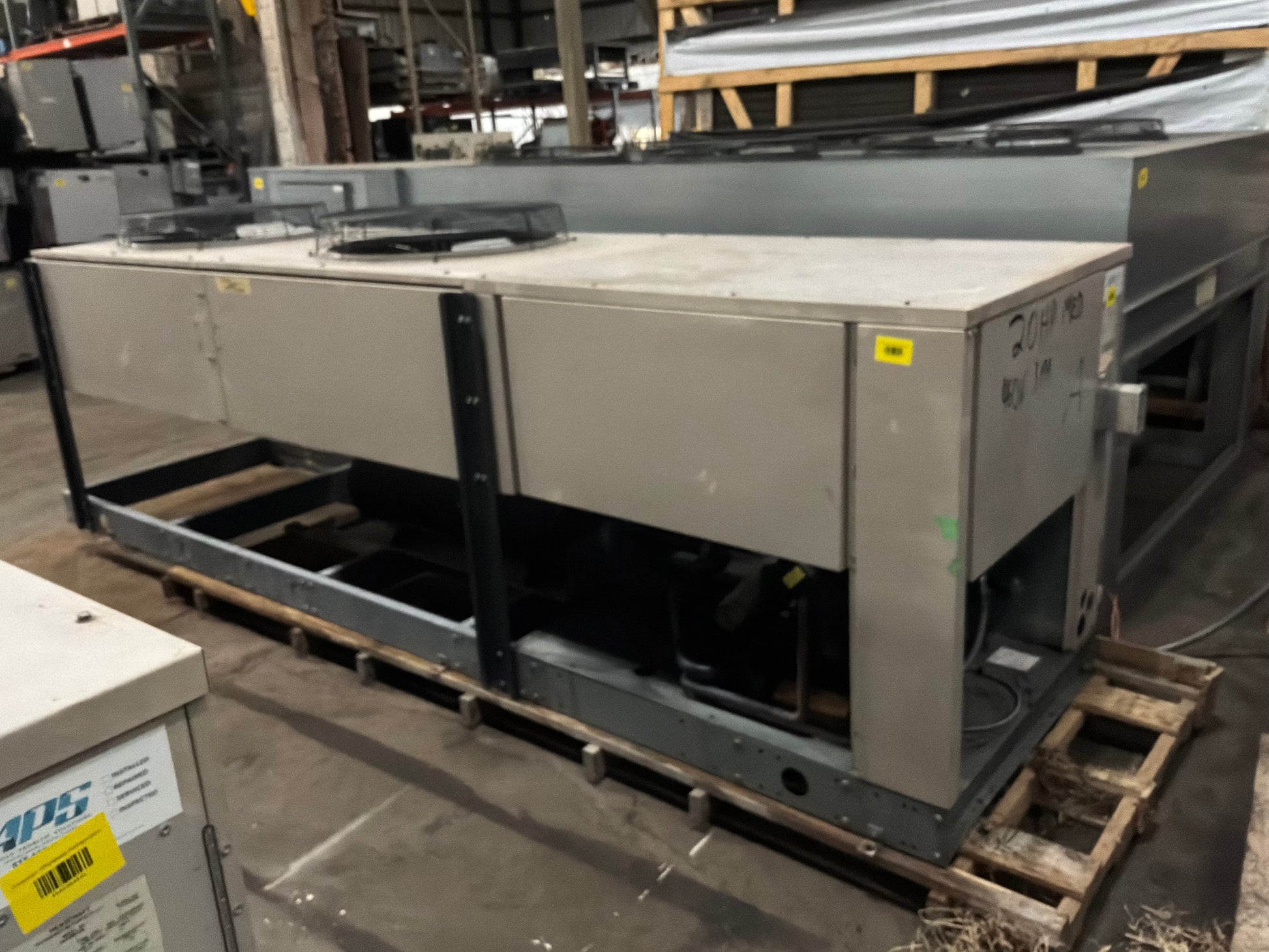 Used 20 HP condensing unit model CDV2001H6D in good working condition with two matching 93,000 BTU air defrost evaporator blowers model CHA930DPA.